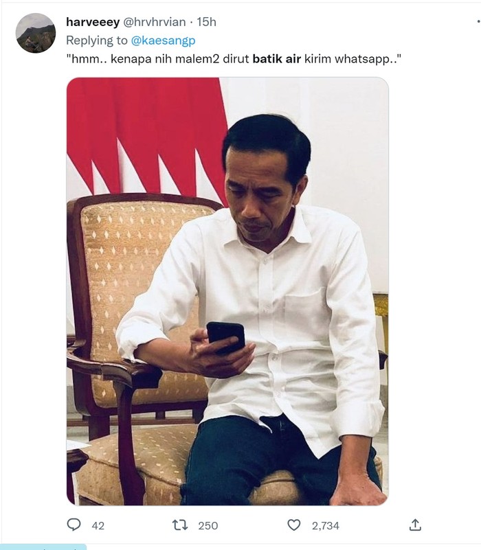 Usai Kaesang lapor kopernya nyangkut ke Medan, ada meme bos Batik Air ceritanya kirim WhatsApp ke Pak Jokowi. Foto: Twitter