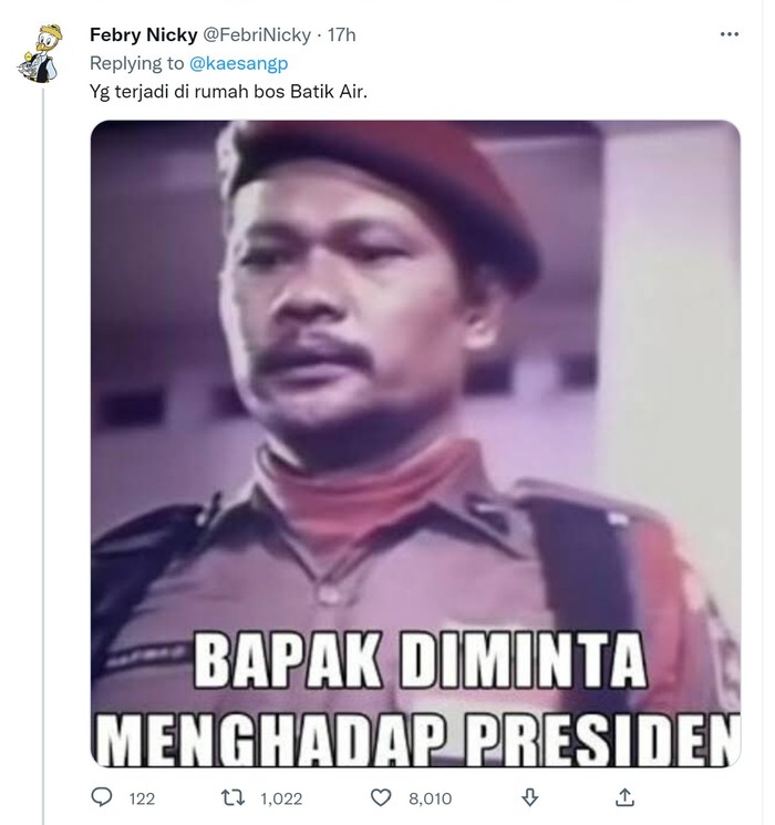 Setelah tweet Kaesang soal kopernya di medan, ada meme bosΒ maskapai diminta menghadap presiden. Foto: Twitter