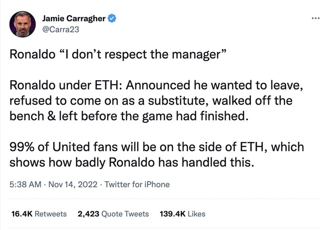 Jamie Carragher mengkritik keras Ronaldo yang menyerang Erik Ten Hag, apalagi Ronaldo kadang indispliner. "99% fans United akan berada di sisi Erik Ten Hag" tulisnya. Foto: Twitter