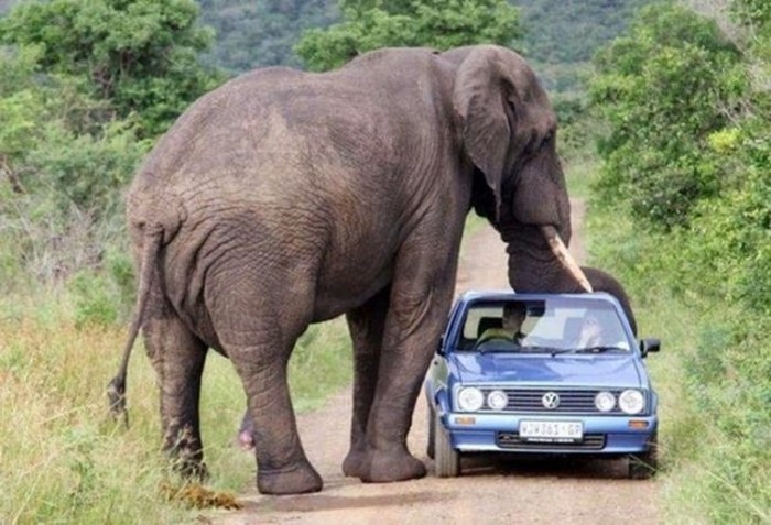 Sedan VW yang ditumpangi pasangan ini saat berkeliling Taman Safari terlihat begitu saat kecil saat melintasi seekor gajah liar disana. Foto: Postoast