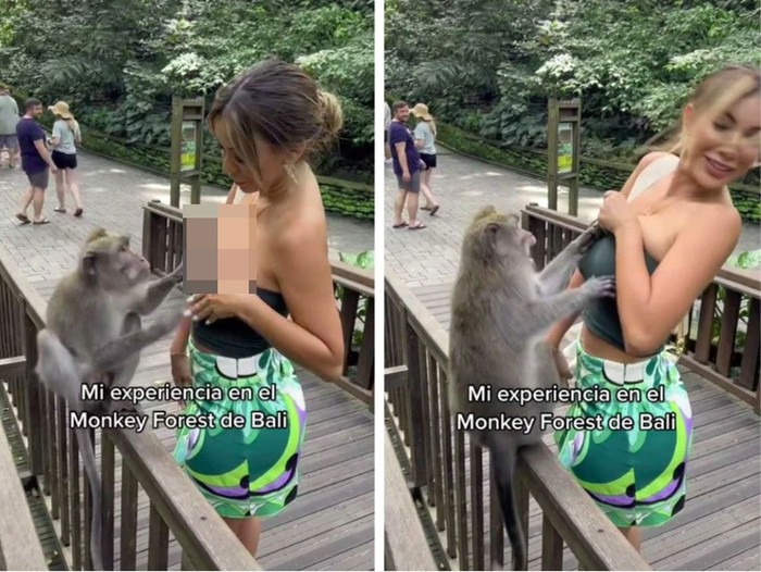 Mantan Miss Peru, Paula Manzal menjadi korban kenakalan seekor monyet di Monkey Forest Ubud, Bali beberapa hari lalu. Foto:Β TikTok Β