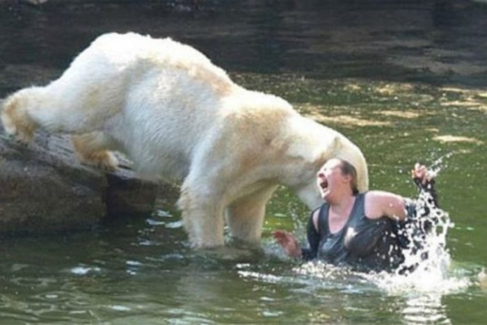 Para pengunjung Kebun Binatang di Berlin tercengang ketikamengetahui Mandy K melompat ke kandang beruang kutub pada tahun 2009. Mantan suaminya menduga Mandy melakukan hal itu karena tertekan akibat tak kunjung mendapatkan pekerjaan. Tindakan Mandy melompat ke kandang beruang dipercaya sebagai upaya bunuh diri. Beruntung Mandy masih dapat diselamatkan meski mengalami luka-luka cukup parah disekujur tubuhnya. Pengelola menuntut Mandy karena dianggap telah merusak reputasi keamanan Kebun Binatang Berlin. Foto: Postoast