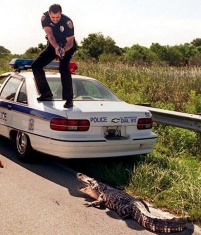 Polisi ini seketika menyadari seekor buaya memutuskan untuk merangkak keluar dari semak terdekat. Dia berhasil naik ke atas kendaraan patrolinya. Buaya memiliki kulit yang tebal, dan terkadang peluru tidak cukup untuk menahannya. Foto: Postoast