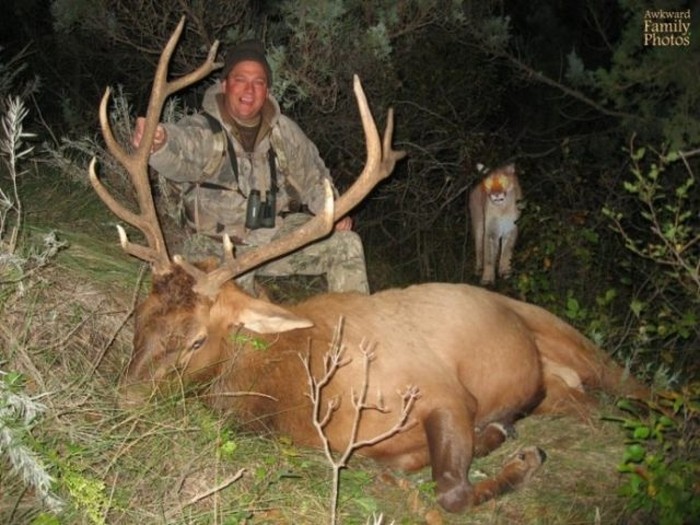Pemburu ini telah membunuh seekor rusa jantan besar hanya untuk diambil darahnya agar cougar datang. Di belakangnya ada seekor singa gunung yang siap menerkam. Foto: Postoast