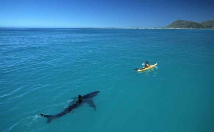 Fotografer Tom Peschak sedang berada di frame terakhir pada rol filmnya ketika dia mengambil foto yang dia tunggu-tunggu: permukaan putih besar di belakang kayak peneliti Trey Snow. βAlih-alih ilmuwan melacak hiu, hiu justru melacak ilmuwan,β kata Pescak. Foto: Postoast