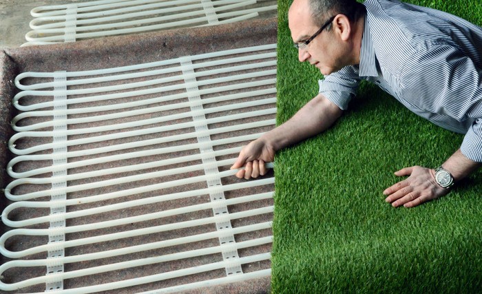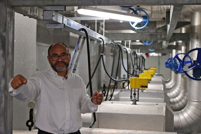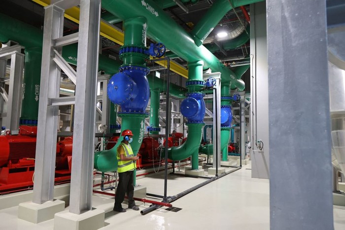 Bagaimana cara kerjanya? Menggunakan energi surya, udara luar didinginkan dan kemudian didistribusikan melalui perangkat di tribun dan pipa besar di sisi lapangan. Sistem di dalam stadion terlihat kompleks seperti ini. Foto: AFP via Getty Images/KARIM JAAFAR