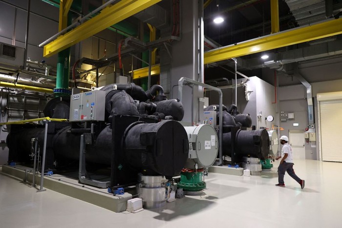 Pekerja memastikan sistem pendinginan ke lapangan bekerja dengan semestinya. Foto: AFP via Getty Images/KARIM JAAFAR