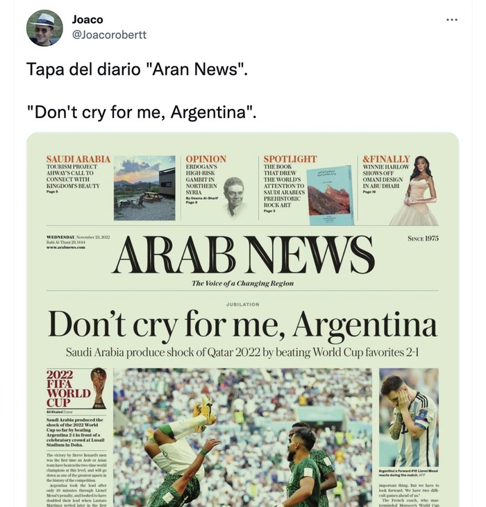 Dont Cry For Me Argentina adalah headline media massa di Arab Saudi saat ini. Foto: Twitter