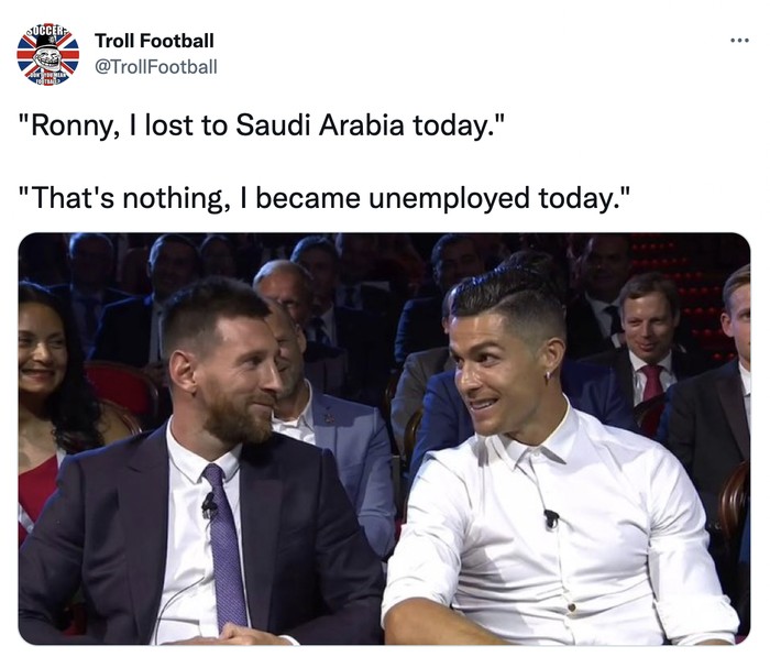 Ronaldo dan Messi saling curhat. "Ronny, aku kalah dari Arab Saudi," kata Messi. "Itu bukan apa-apa, hari ini aku jadi pengangguran," balas Ronaldo. Foto: Twitter