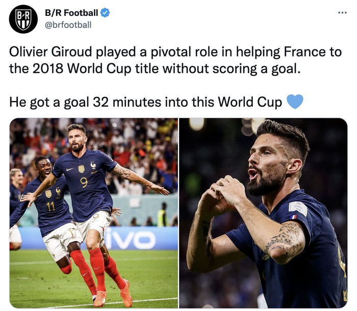 Meme Giroud tidak terima ketika absennya Benzema dianggap membuat Perancis keteteran. Ia langsung menjawab dengan melesakkan dua gol ke gawang Australia. Foto: Twitter