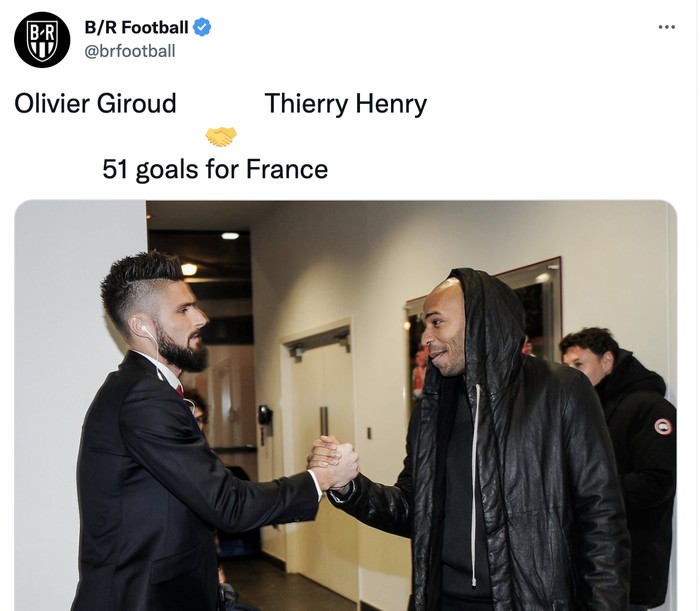 Dengan mencetak total 51 gol untuk timnas Perancis, Giroud menyamai legenda Thierry Henry sebagai pencetak gol paling banyak buat negara itu. Foto: Twitter