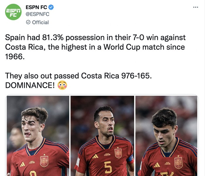 Spanyol begitu menguasai laga dengan possesion 81,3% dan 976 passing. Foto: Twitter