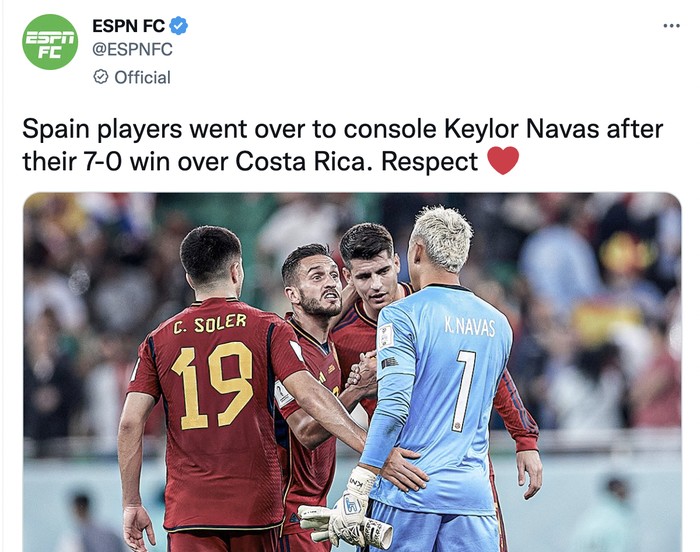 Pemain Spanyol bersimpati pada kiper Kosta Rika Keylor Navas usai pertandingan. Foto: Twitter