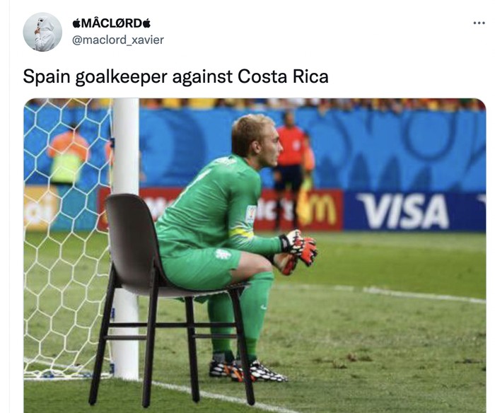 Kiper Spanyol sampai bisa duduk manis di sepanjang pertandingan lawan Kosta Rika. Foto: Twitter