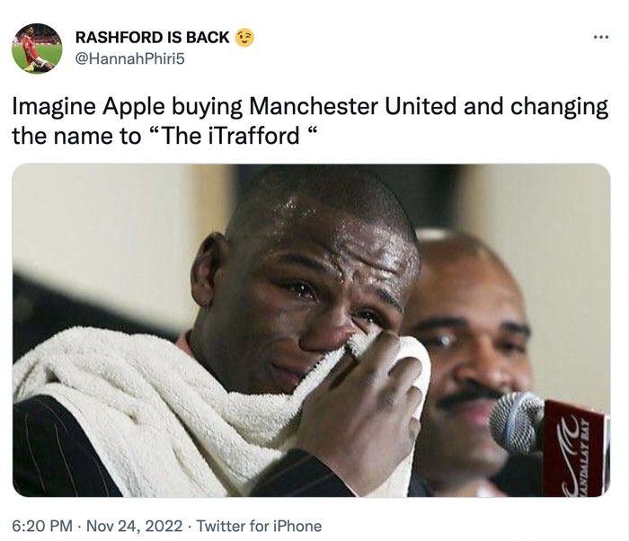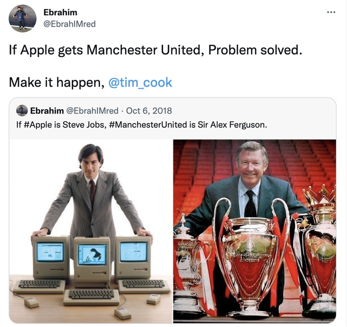 Jakarta - Apple dikabarkan tertarik membeli Manchester United yang baru saja diumumkan dijual oleh sang pemilik keluarga Glazer. Ini meme yang beredar soal itu.