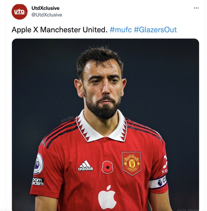 Atau cukup dengan memajang logo Apple di kostum MU seperti ini. Foto: Twitter
