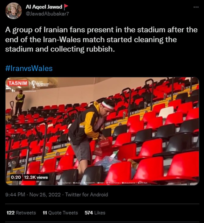 Keren, usai pertandingan, fans Iran membersihkan stadion. Foto: (Twitter).
