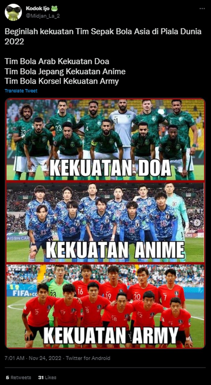Kurang lebih begini sumber kekuatan dari tim Asia yang bertanding. Foto: (Twitter).