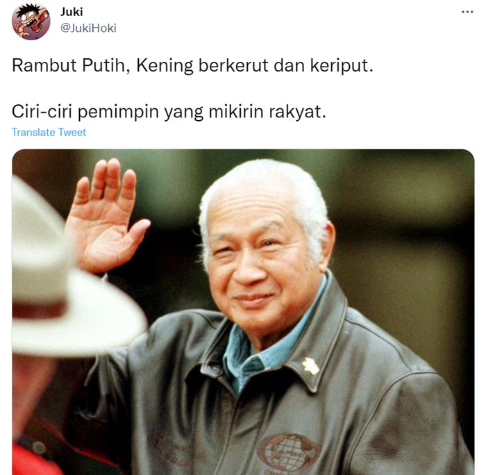 Kartunis Juki memilih almarhum Presiden Soeharto sebagai pemimpin berambut putih. Foto: (Twitter)