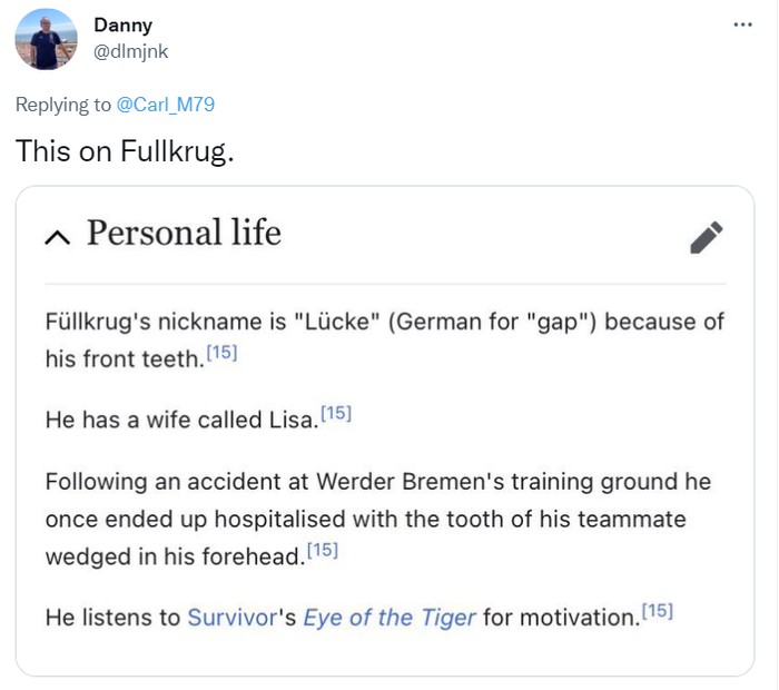 Banyak fans membagi kisah unik Fuellkrug di Twitter, mulai dari bentuk giginya yang ada celah besar, sampai kisah gigi temannya menancap di jidat Fuellkrug. Foto: (Twitter)