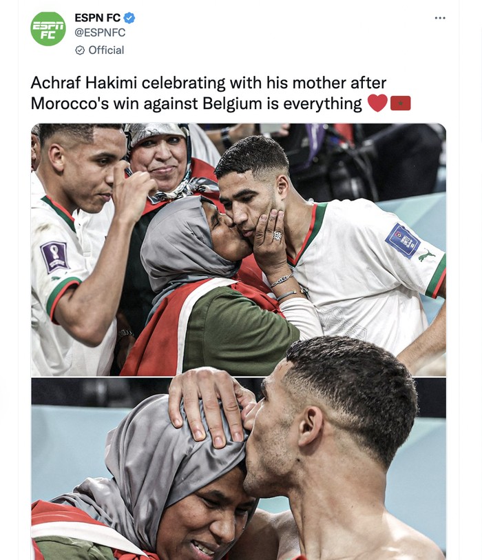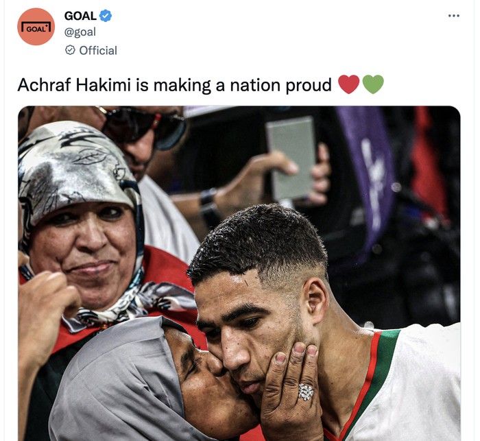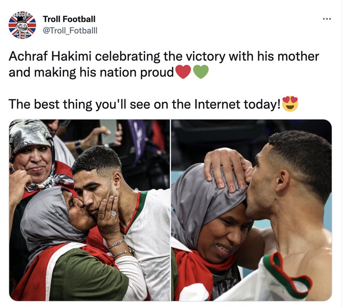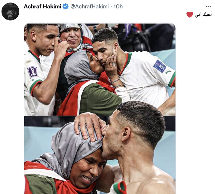 Akun Twitter Achraf Hakimi menampilkan bagaimana dia mencium dan dicium sang ibu tercinta usai Maroko menaklukkan Belgia 2-0. Caption bertuliskan "Aku cinta kamu, Ibu." Foto: Twitter
