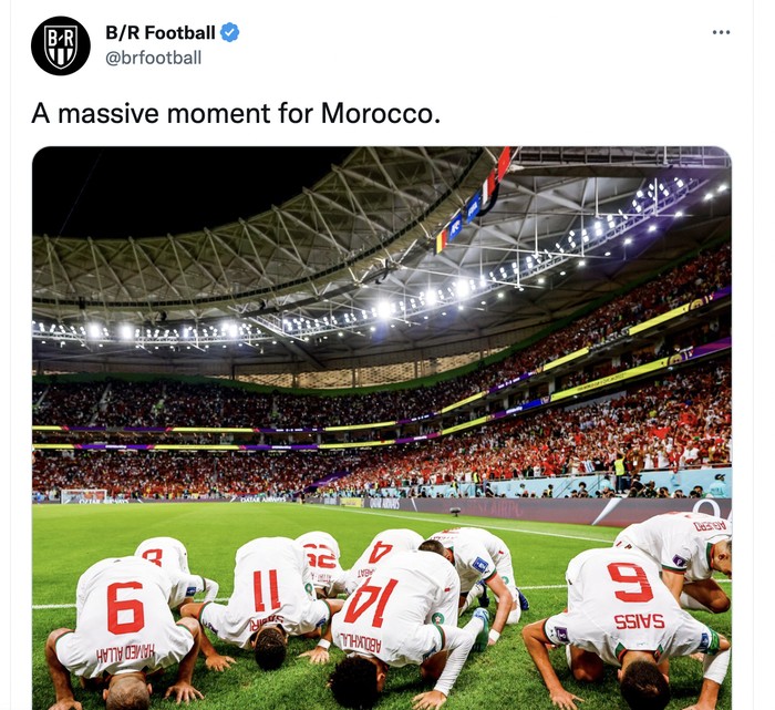 Para pemain Maroko langsung bersujud usai mengalahkan Belgia yang jauh lebih diunggulkan. Foto: Twitter