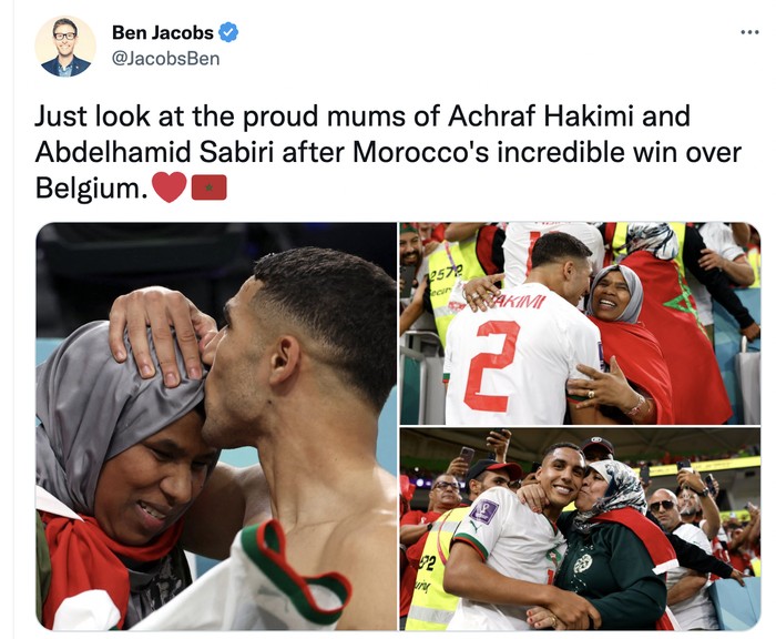 "Lihatlah betapa bangga ibu Achraf Hakimi dan juha Sabiri setelah kemenangan luar biasa Maroko atas Belgia," tulis akun ini. Foto: Twitter