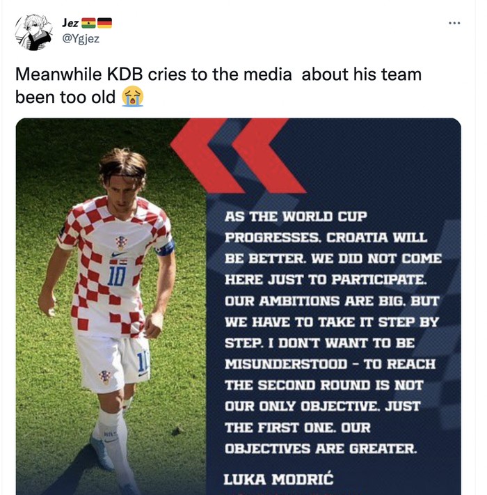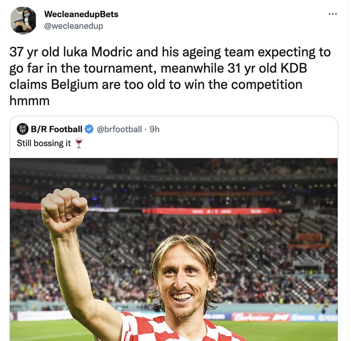 "Luka Modric yang berumur 37 tahun dan timnya berharap melangkah jauh di turnamen ini sementara KDB yang berusia 31 tahun mengklaim Belgia terlalu tua untuk memenangkan kompetisi," cetus akun ini. Foto: Twitter