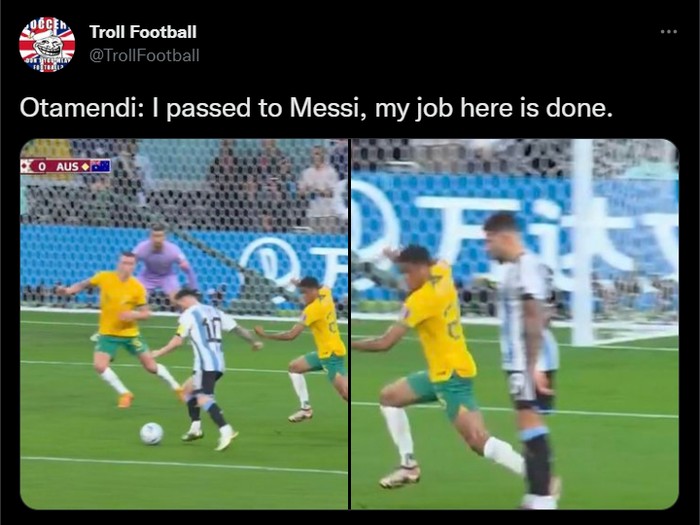 Otamendi langsung terdiam setelah mengumpan bola kepada Messi. Foto: Screenshot/Twitter