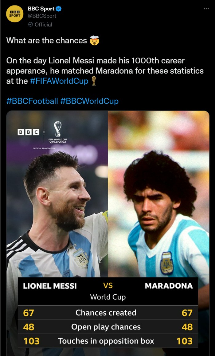 Penampilan Messi di Piala Dunia menyamai pencapaian Diego Maradona. Foto: Screenshot/Twitter