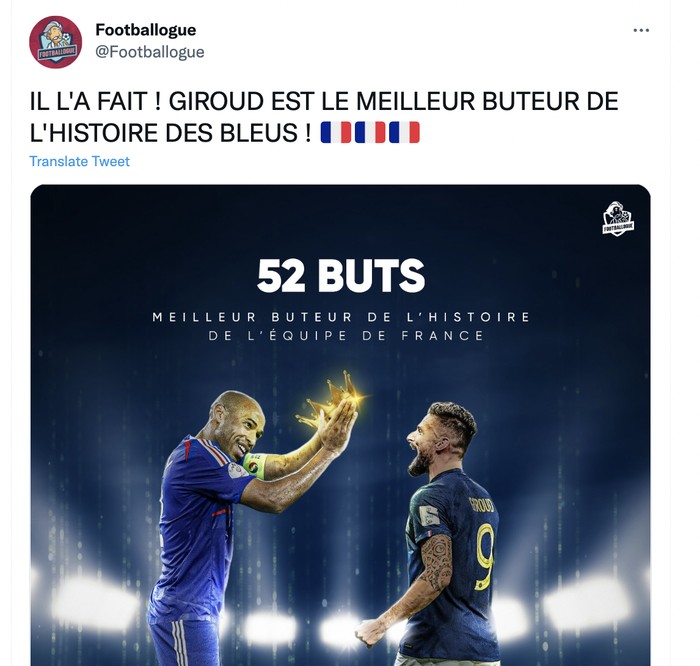 Dengan 52 gol, Giroud telah melampaui torehan Thierry Henry. Foto: Twitter