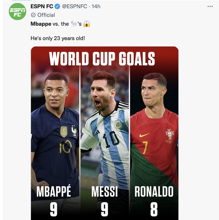 Mbappe jelas juga luar biasa, bahkan di umur yang begitu muda sudah hampir menyamai total gol Messi dan Ronaldo di Piala Dunia. Foto: Twitter