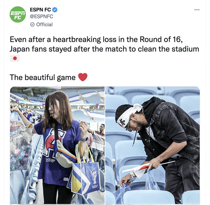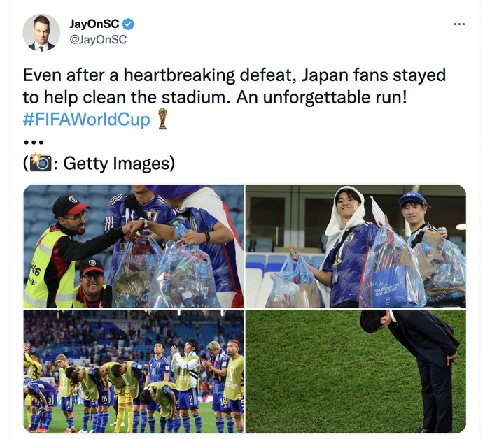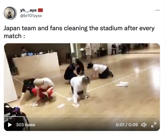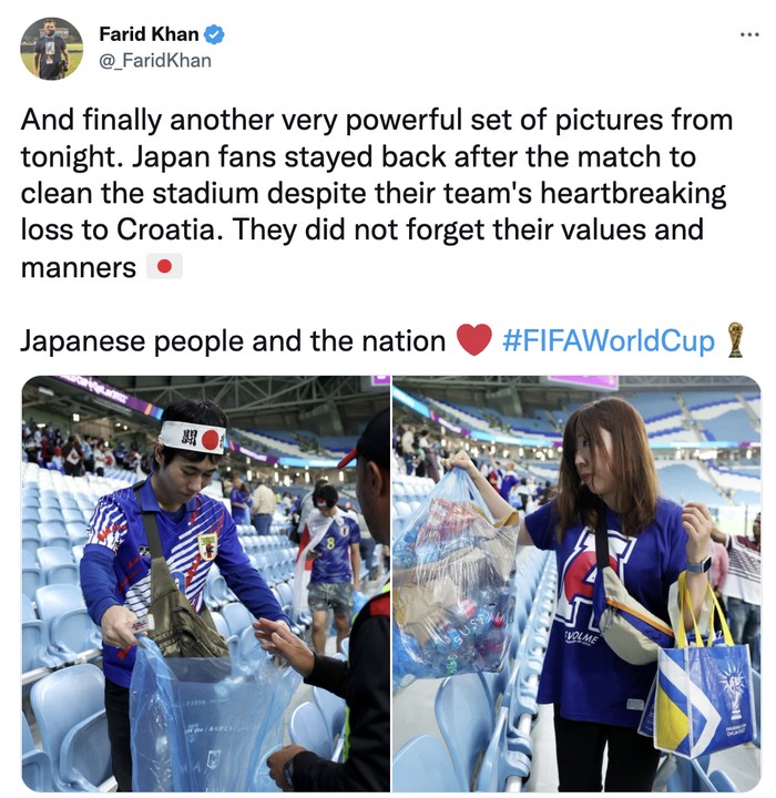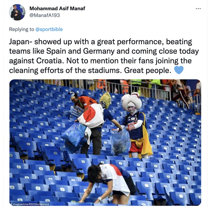Jepang menampilkan performa yang hebat, belum lagi para fans-nya yang mendukung dengan sopan dan suka kebersihan. Foto: Twitter