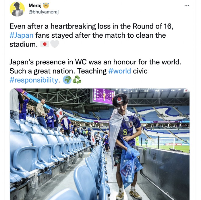 Bahkan setelah kekalahan menyakitkan dari Kroaasia, fans Jepang tetap tinggal usai laga untuk membersihkan stadion. Foto: Twitter