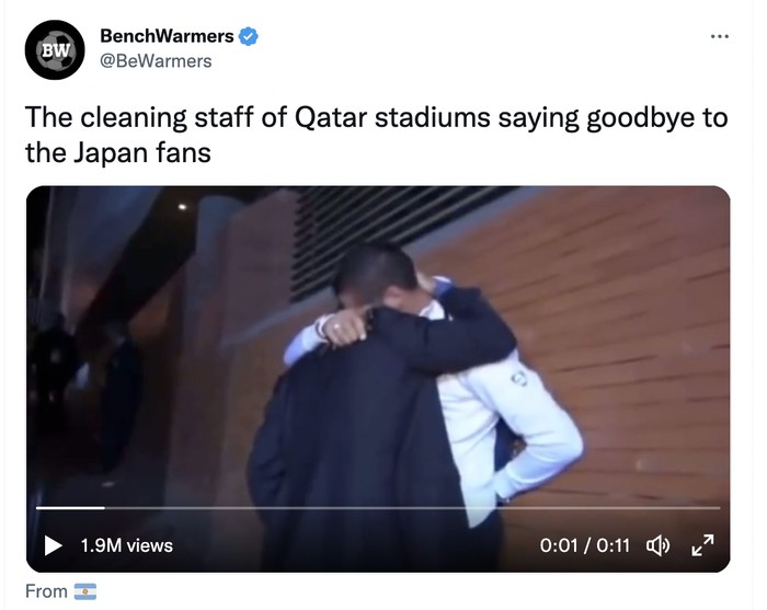 Meme karyawan kebersihan di stadion Qatar sedih karena akan ditinggal fans Jepang. Foto: Twitter