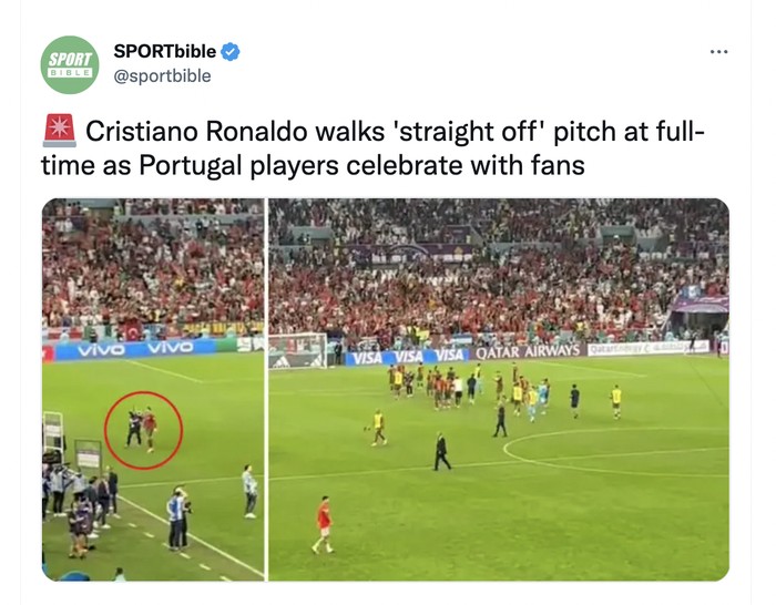 Ronaldo disorot karena tampak tidak ikut merayakan kemenangan Portugal saat laga usai. Foto: Twitter