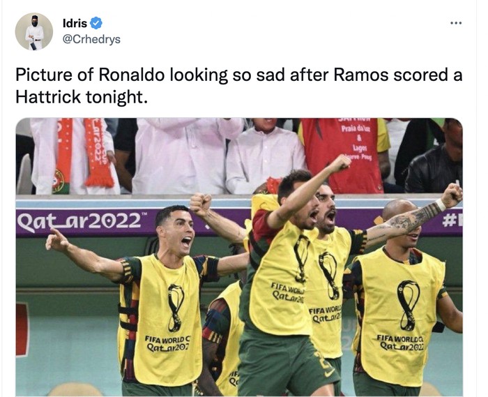 Foto Ronaldo terlihat 'sedih" setelah Ramos mencetak hatrick. Tentu ini adalah sindiran sarkas. Foto: Twitter