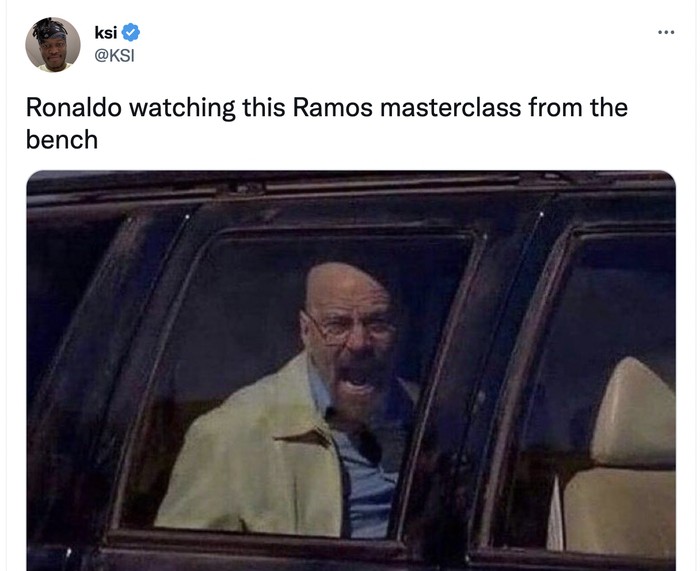 Meme Ronaldo tidak senang Ramos mencetak hatrick. Foto: Twitter