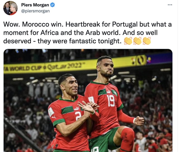 Wow, Maroko menang, patah hati untuk Portugal tapi sungguh momen besar bagi Afrika dan dunia Arab, tulis Piers Morgan. Foto: Twitter