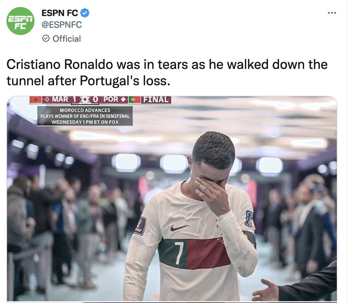 Sementara itu, tangis Ronaldo pecah usai Portugal gagal melaju ke semifinal Piala Dunia 2022. Foto: Twitter