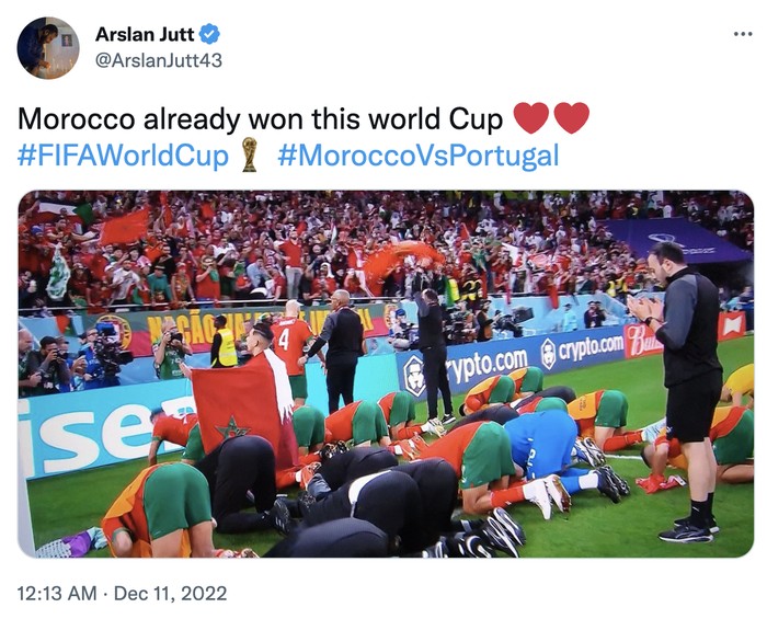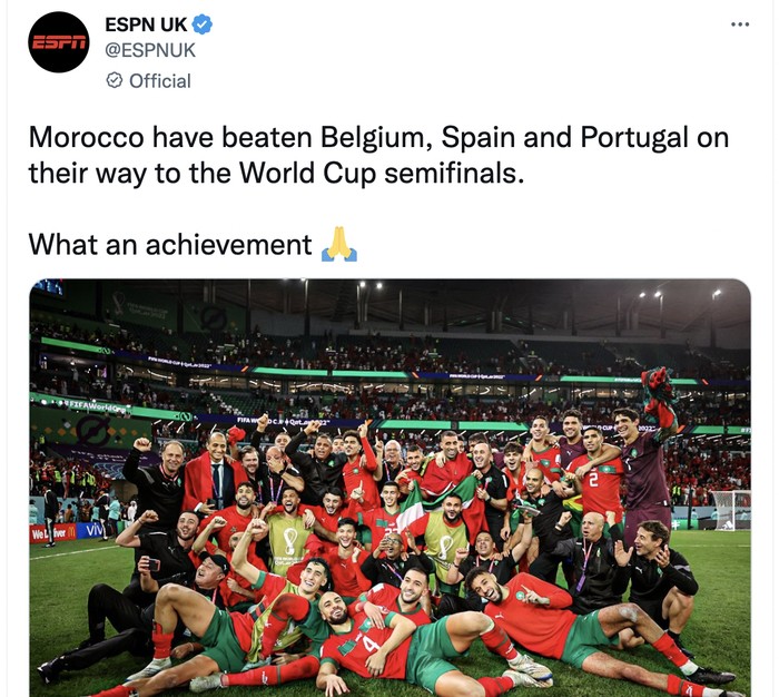 Memang sungguh luar biasa penampilan Maroko, mengalahkan Belgia, Spanyol dan kinii Portugal. Foto: Twitter