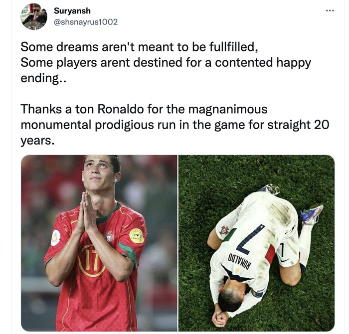 Walau Ronaldo tampaknya masih akan lanjut main sepakbola, banyak netizen tetap merasa ini adalah akhir dari sebuah era. Ini adalah Piala Dunia terakhir Ronaldo dan dia juga baru saja didepak dari MU. Foto: Twitter