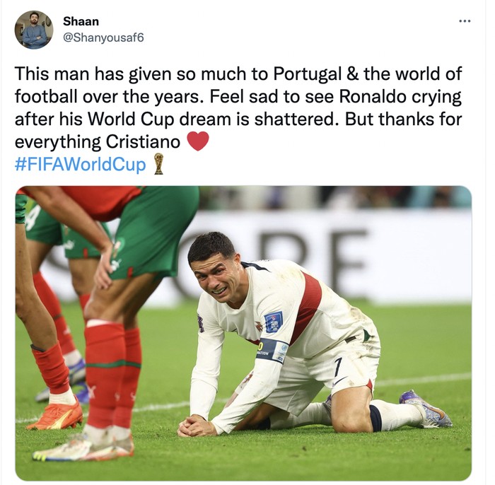 "Pria ini telah memberikan begitu banyak untuk Portugal dan dunia sepakbola selama bertahun-tahun. Sedih Ronaldo menangis setelah impian Piala Dunia-nya runtuh. Tapi terima kasih untuk segalanya," cetus netizen ini. Foto: Twitter