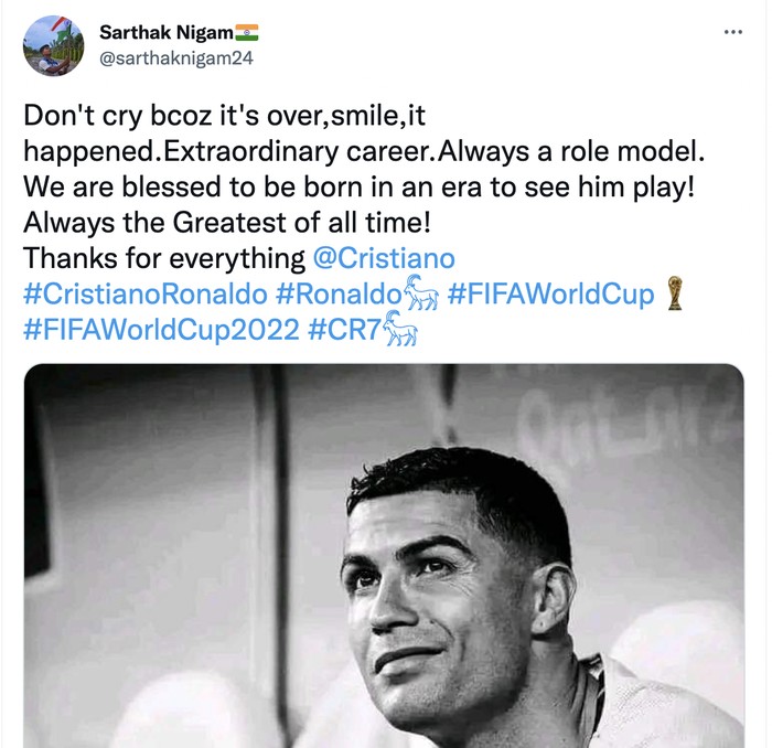 "Jangan menangis karena sudah selesai, tersenyumlah karena sudah terjadi. Karir luar biasa, selalu menjadi teladan. Kami diberkati lahir di era yang saa denganmu. Terima kasih untuk semuanya, Cristiano," sebut akun ini. Foto: Twitter