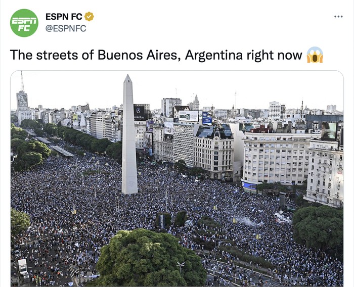 Jalanan di Buenos Aires begitu penuh dengan manusia merayakan kemenangan Argentina. Foto: Twitter