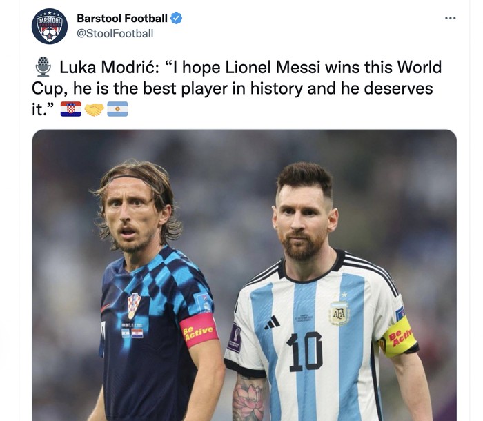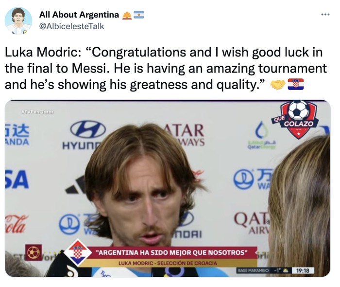 "Semoga beruntung, Messi. Dia menjalani turnamen yang mengagumkan dan menunjukkan kehebatannya," kata Modric usai Argentina dan Messi mengalahkan Kroasia 0-3. Foto: Twitter