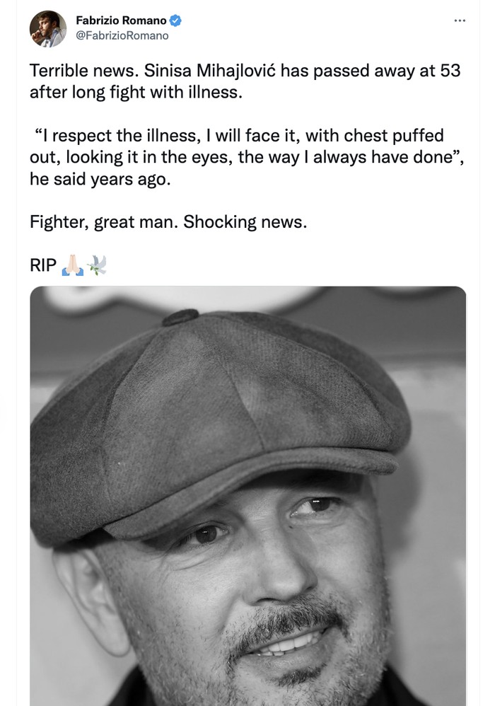 "Kabar menyedihkan, Sinisa Mihajlovic meninggal dunia di usia 53 tahun setelah perjuangan panjang melawan penyakit," sebut Fabrizio Romano. Dia adalah bek legendaris yang pernah membelaΒ AS Roma, Lazio, dan Inter Milan. Foto: Twitter