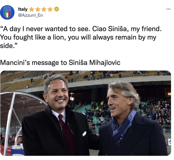 "Sampai jumpa temanku Sinisa. Kamu berjuang seperrti singa, kamu akan selalu ada di sampingku," ucap Roberto Mancini. Foto: Twitter
