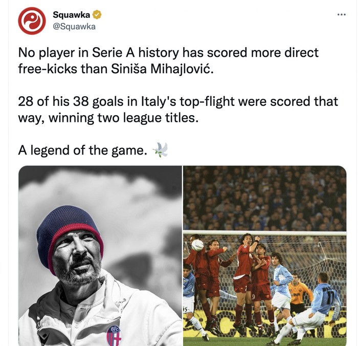 Sinisa dikenal raja tendangan bebas meski dia seeorang bek. "Tidak ada pemain dalam sejarah Seria A mencetak gol laongsung dengan tendangan bebas lebih banyak dari Sinisa," tulis akun ini. Foto: Twitter