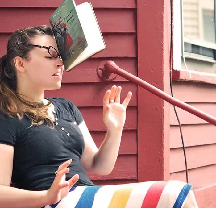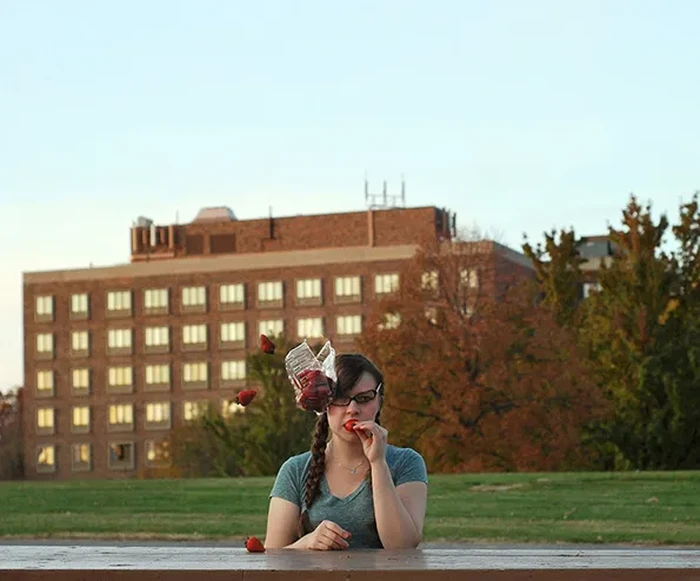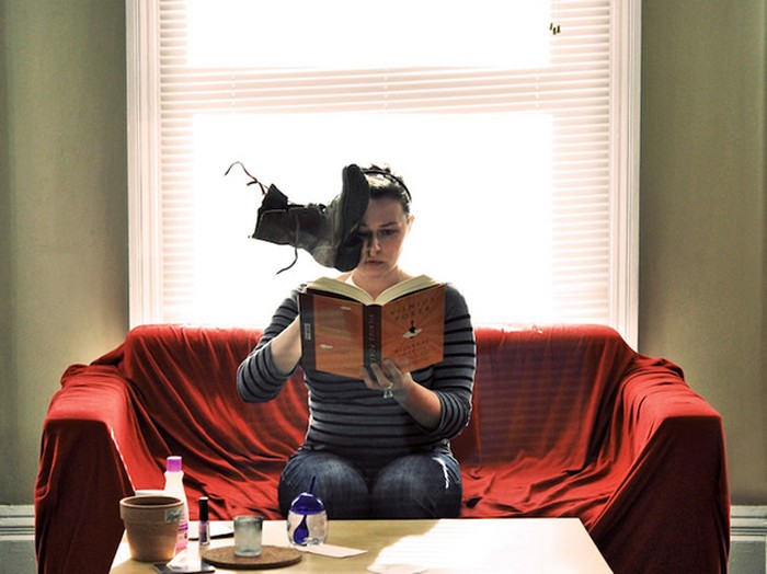 Staumanis mengubah adegan sehari-hari saat berjalan di taman atau membaca buku menjadi momen ditimpuk dengan berbagai benda. Foto: Kaija Straumanis